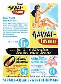 | | burbon "instant tiefenbräuner ohne Sonne ...ohne Farbstoff" - "Alle wirken jünger, froher, gesünder"" | | Delial "schenkt reizvoll samtne Sonnenbräune" - "So schnell so wunderbar braun" |