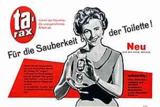 | | HAKLE - "In jedem gepflegten Hause Perlkrepp" | | "ta-rax nimmt der Hausfrau die unangenehmste Arbeit ab. - Für die Sauberkeit der Toilette!" | | "Das neue 00 Null-Null - Jetzt super-aktiv, schäumend u. sprudelnd u. mit Sparsieb - besser denn je!" |