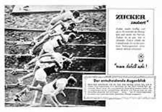 | | |  | | | | | "Zucker zaubert* - Zucker macht kräftig und aktiv. Er vertreibt die Mattigkeit und stärkt die Nerven. Zucker ist so gut, wie er schmeckt. Zucker erhöht die Lebensfreude. Er ist das leichteste Nahrungsmittel: erfrischend, schlank erhaltend. - *Nimm deshalb mehr!"