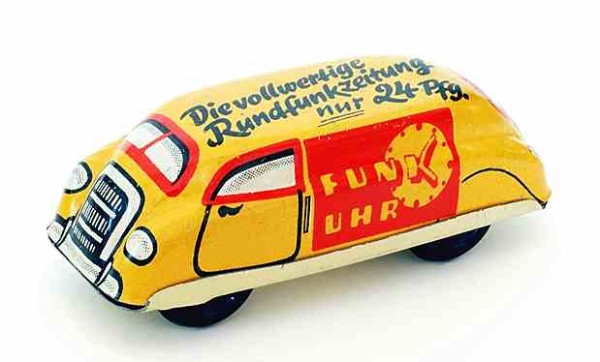 | | Einfaches Blechauto, wohl Werbegeschenk - "Funkuhr - Die vollwertige Rundfunkzeitschtrift nur 24 Pfg.", Länge 7cm |
