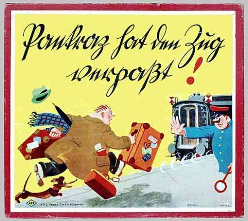 | Bei manchen Spielen interessieren mich weniger Inhalt und Spielidee als vielmehr eine besonders gelungene Illustration der Schachtel. Dieses hier mit seiner originellen Bahnhofsszene gehört dazu: "Pankraz hat den Zug verpaßt!", ABC Verlag GmbH Nürnberg