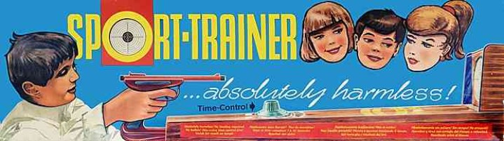 | Technofix 318 "Sport-Trainer" - Der Abzug der Pistole ist mit einem Mechanismus verbunden, der von hinten Löcher in die (auswechselbare) Papp-Zielscheibe stanzt. Trotz aller Vorbehalte, dass solch ein Schießgerät eigentlich nicht unbedingt in Kinderhände gehören sollte: klasse Effekt! (1967)
