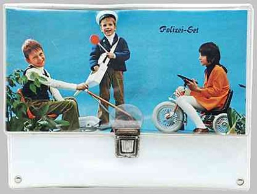 | "Polizei-Set", die Tasche mit Schultergurt enthält Pistole samt Halfter, Polizeikelle, Trillerpfeife, Polizeimütze - und einen Bleistift...