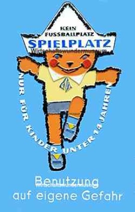 | Typische Spielplatzschilder der 1960er Jahre - oben: "Kein Fussballplatz - Spielplatz" 34 x 54 cm, Hersteller: Metallgiesserei und Schilderfabrik Lino Facco, Mannheim-Rheinau, 1964