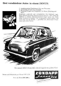benannt nach dem doppelgesichtigen Gott der Römischen Mythologie, bietet er Platz für 4 Personen, die auf zwei Sitzbänken Rücken an Rücken sitzen. Laut Werbung handelt es sich um „eine zukunftsweisende Kleinautokonstruktion“, zumal sich die Sitze auch noch zu bequemen Schlafliegen umfunktionieren lassen. Durch diese neuartige Anordnung sehen „vier Augenpaare hinten und vorne alles auf der Straße und genießen das Breitwand-Panorama nach allen Seiten.“ Bei Zündapp ist man sich des Erfolges sicher: „Wer einmal Janus fährt, erkennt sogleich den großen Wert.“ Von der zeitgenössischen Fachpresse durchaus wohlwollend aufgenommen, erweist sich schließlich der 250-ccm-Motor im Alltagsgebrauch als zu schwachbrüstig, sodass insgesamt nur ca. 7000 Exemplare die Fabrikhallen verlassen.