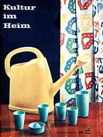 | | | | "Blumengießer", um 1961, Polystyrol, Länge 30 bzw. 36 cm, VEB Glasbijouterie Zittau, Gestalter Klaus Kunis | | Kultur im Heim - Titel: "Plastwerkstoffe, diese "Allerweltsmaterialien" der Neuzeit, stellen wir in diesem Heft vor." - Weitere Themen z.B.: "Zukünftige Wohnform in Stalinstadt bereits Wirklichkeit", "Die Form des Unscheinbaren" | | |