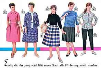"Neue Häuser - junge Frauen" "Frühlingssonne, neue Wohnhäuser, weiße Wäsche gegen blauen Himmel - ein Anblick der optimistisch stimmt. Viele junge Menschen sind heute glückliche Besitzer moderner AWG-Wohnungen, in denen gesunde Kinder heranwachsen. Froh und unbekümmert kann deshalb die junge Frau in die Zukunft blicken und sich auf die Ankunft ihres Kindes freuen. Auch mit ihrer veränderten Figur will sie hübsch gekleidet sein." - Aus "Guter Rat für heute und morgen"