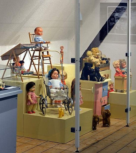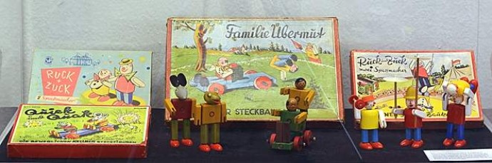 |  | Kaufmannsläden …gibt es schon seit dem 17.Jahrhundert. Sie dienten ursprünglich nicht nur Spielzwecken, sondern sollten Kinder auch an den Umgang mit Geld und an die Kunst des Handelns heranführen. Wie übergroß die Bandbreite der in der DDR gefertigten Kinderkaufläden war, konnte auf dem Petersberg bereits vor einiger Zeit in einer speziellen Ausstellung zu diesem Thema entdeckt werden. – Etliche dieser Läden fanden durch Export den Weg „in den Westen“. |  | Puppenhäuser Puppenhäuser und Puppenstuben spiegeln anschaulich die Wohnkultur ihrer jeweiligen Entstehungszeit. Von der Schrankwand über den Fernseher bis hin zum Designerstuhl ist alles im Miniaturformat vertreten – es gibt nichts, was es nicht gibt. Das hier gezeigte „Haus Sonnenschein“ wurde vom VEB Grünhainichen produziert, die Püppchen stammen überwiegend von der Firma ARI (August Riedeler, Königsee) – arrangiert wurde die Szene mit einem Augenzwinckern. |  | Juniorfon Was haben die Puppe im schicken Hosenanzug aus Malimo-Kunstfaser und der Berliner Bär gemeinsam? – Beide können „sprechen“. Heute für Spielzeuge eine Selbstverständlichkeit, war das in den 1960er und auch noch 1970er Jahren durchaus etwas Besonderes. Verantwortlich dafür waren kleine Plast-Schallplatten, die über jeweils eingebaute analoge Laufwerke – oder auch mit dem „Juniorfon“ abgespielt werden konnten. |  | Papierpuppen …dokumentieren die Mode ihrer Zeit. Wer keine Bögen hatte, schnitt sich Figuren und Kleidung aus Katalogen oder Zeitschriften aus. |  | Messemännchen / Raucher-Mäcky Das für die Leipziger Herbstmesse 1964 vom Sandmännchen-Erfinder Gerhard Behrendt entworfene „Messemännchen“ war das Maskottchen dieser Veranstaltung. Ursprünglich aus Holz gefertigt, waren vor allem die späteren Exemplare aus Plaste häufig in den DDR-Kinderzimmern zu finden. – Der DDR-„Mäcky“ orientierte sich sicherlich an dem in der Bundesrepublik ausgesprochen populären „Mecki“, dem Maskottchen der Fernsehzeitschrift „HörZu“. |  | Militärisches Spielzeug „Kriegsspielzeug“ gibt es in der DDR als fröhlich buntes Sandkastenspielzeug schon für die Kleinsten zu kaufen. Aufschluss über die dahinter stehende Ideologie gibt ein Beitrag in dem Fachbuch „Spielzeug“ aus dem Jahr 1958: „Der Erwachsene hat in Bezug auf militärisches Spielzeug und vor allem den Umgang des Kindes mit solchen Gegenständen nicht nur eine sehr schwierige, sondern auch eine in hohem Grade moralische Aufgabe. Gilt es doch, Sinn und Zweck des Spielzeugs in einer einfachen, dem Kinde sofort eingängigen Form zu erläutern. Denn die Funktion des Gewehrs als Waffe, mit der man in der Lage ist, andere Menschen zu töten, ist nur ein Teil der notwendigen Erklärung, die das Kind von seinem Erzieher erhalten muss. Wenn aber das Kind erfährt, dass es böse Menschen gibt, die nur zu gerne in seinen Lebensbereich eindringen würden, dass aber diese bösen Menschen gerade über solche Waffen verfügen, dann weiß es, dass es die Waffen dann gebrauchen wird, wenn es gilt, seine Heimat gegen solche Eindringlinge zu verteidigen." |  | Gesellschaftsspiele Obwohl sie sehr viel Spielspaß versprechen, führen traditionelle Gesellschaftsspiele im Zeitalter digitaler Unterhaltungselektronik leider nur noch ein Schattendasein. - Vielleicht lässt sich ja der eine oder andere Besucher dieser Ausstellung durch den Anblick der in dieser Vitrine gezeigten DDR-Klassiker dazu animieren, einmal wieder die alte Spielesammlung hervorzuholen und einen PC- und fernsehfreien Abend einzulegen… |  | Halma Die beiden Spiele aus den Jahren 1950 bzw. 1982 dokumentieren durch ihre aussagekräftigen Deckelbilder mit zeitgenössischen Familienbildern anschaulich die gesellschaftlichen Entwicklungen. |  | Kugelspiele Spiele dieser Art finden heute nur noch am PC oder auf dem Smartphone statt. Ob das eine besser war als das andere, mag jeder für sich selbst entscheiden. |  | Murmeln und Kreisel Stundenlangen Spielspass ganz ohne Technik boten Murmeln (auch Märbel, Klicker, Knicker, Marbeln, Schusser etc. genannt) und Kreisel. Die „Peitschenkreisel“ wurden durch eine herumgewickelte und schnell weggezogene Peitschenschnur in Rotation versetzt und konnten durch geschickte Peitschenschläge lange in Bewegung gehalten werden. |
