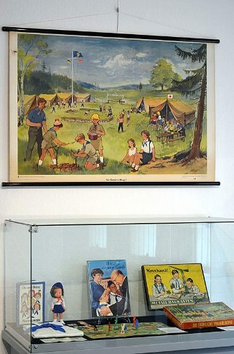 | Digedags Die vom Zeichner Hannes Hegen (wirklich: Johannes Hegenbarth) entwickelten Digedags waren zwischen 1955 und 1975 die Protagonisten der DDR-Comiczeitschrift MOSAIK. Die hier zu sehenden Stoffpuppen stammen zwar nicht mehr aus DDR-Zeiten, besitzen aber dennoch eine hohe Aussagekraft, da sie 2001 mit zu den letzten Erzeugnissen der „Sonni GmbH Sonneberg“ gehörten, wo man versuchte, die traditionsreiche Sonneberger Spielzeugproduktion auch nach der Wende aufrecht zu halten. Alle Bemühungen waren jedoch letztlich vergebens: Das Unternehmen musste 2005 aufgeben. |  | Baukästen In der DDR gab es ein vielfältiges Angebot an Baukästen. Nachdem in den 1950er Jahren vor allem die traditionellen Materialien Stein, Holz und Metall Verwendung fanden, wurden im Verlauf der 1960er Jahre zunehmend Plaste eingesetzt. |  | Kellner-Steckbaukästen Der erste Baukasten des 1919 in Tabarz im Thüringer Wald gegründeten Traditionsunternehmens Kellner wurde bereits Ende der 1920er Jahre produziert. Das neu entwickelte und ebenso originelle wie zeitlose Stecksystem, bei dem die Elemente durch Gummihülsen miteinander verbunden werden, kam bei den Käufern so gut an, dass es Baukästen dieser Art auch heute noch zu kaufen gibt. |  | Pionierorganisation Ernst Thälmann Dieser nach sowjetischem Vorbild entstandenen politisch motivierten Massenorganisation gehörten in der DDR fast alle Kinder an - ab dem 1. Schuljahr als "Junge Pioniere" (Erkennungsmerkmal: weißes Hemd mit Pionieremblem und ein blaues Halstuch) und anschließend vom 4. bis zum 7. Schuljahr als "Thälmannpioniere" (rotes Halstuch). Der Leitspruch der Pioniere lautete: "Für Frieden und Sozialismus: Seid bereit!" In diversen Gesellschaftsspielen wird die Vorbildfunktion der Pioniere thematisiert. |  | Selbst ist der Mann (und auch die Frau…) Häufig war in der DDR selbst gebasteltes Spielzeug zu finden, das nach Vorlagen aus Bastelbüchern oder mit sehr viel Phantasie nach eigenen Vorstellungen gefertigt wurde. Nach der Wende für nicht mehr gut genug befunden, fand sich vieles im Sperrmüll wieder. Einige der in dieser Vitrine gezeigten Exponate wurden seinerzeit im wahrsten Sinne des Wortes „von der Straße aufgelesen“. |  | Beispiel für Wandbehang |  | Beispiel für eine Spielecke | Zur MDR-Fotostrecke "So viel DDR-Spielzeug"