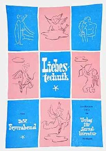 | | "Liebestechnik" - "erschienen 1954 im Verlag für Sexualliteratur Stuttgart" - "Dieses Handbuch gibt jedem halbwegs intelligenten Menschen die sichere Möglichkeit, sein Leben frei und mit Bewußtsein zu gestalten. Nicht mehr die drohende Peitsche einer unerwünschten Schwangerschaft schwebt über dem sexuellen Verlangen."