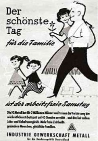 | | JAB Industrie-Hebebühne - "Sie sparen Arbeitskräfte und erleichtern Ihrem Personal die Arbeit - Wir bauen für Sie Plattform-Hebebühnen und Lastenaufzüge für alle Zwecke, Lasten und Hubhöhen." | | "Der schönste Tag für die Familie ist der arbeitsfreie Samstag - Die IG Metall hat für 2 Millionen Männer und Frauen die Verkürzung der wöchentlichen Arbeitszeit auf 45 Stunden erreicht - und das bei vollem Lohn- und Gehaltsausgleich." - Zeitschriftenwerbung