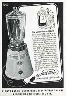 | | "...besser ist ein StarMix – der Pionier unter den Küchenmaschinen – Traum jeder Hausfrau – 350 und 480 Watt. " (1953) | | |  | |  | | "...besser ist ein StarMix – die neue kombinierte Universal-Küchenmaschine mit allen sprichwörtlich guten Eigenschaften des Starmix - 500 Watt - durch viele Zusatzgeräte ausbaufähig." (1953) | | "Jetzt sollte man eben wissen, was zu deinem Star-Mix und was zu meinem Roller gehört.", Witzzeichnung (1955)