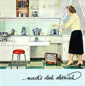 | | "Elektro-Berater für Heim und Familie" - "Der große Frühjahrsputz und die Geschenke diesmal elektrisch!" - "Putztag ohne Müh und Plag!" (1956) |  | |  | Der Elektrohaushalt - "Lange Zeit lag die Fruchtpresse des Küchenmotors unbenutzt. Zur Obsterntezeit aber tritt sie wieder in Aktion, denn kein Marmeladenglas, keine Saftflasche soll leer bleiben." (1956)"