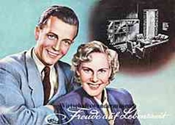 "Freude auf Lebenszeit" "Anbaumöbel... ursprünglich geboren aus dem Gedanken, die Wohnraumenge unserer Zeit zu überbrücken, hat man mit ihrer Schaffung nicht nur aus der Not eine Tugend gemacht, sondern sie darüber hinaus zu etwas Endgültigem und Selbstständigem entwickelt, das auch dann Berechtigung haben wird, wenn wir dereinst über das Kapitel Wohnraumnot die Überschrift "Es war einmal..." setzen können." - Möbel-Hübner, Berlin - "Alleinverkauf Musterring-Möbel", Möbelkatalog (O.J., schätzungsweise frühe 1950er Jahre. Allerdings enthält der Katalog auch Elemente, die eher den 1930/40er Jahren zuzuordnen sind. Möglicherweise handelt es sich also um eine in den 50ern teilweise überarbeitete Vorkriegsausgabe)
