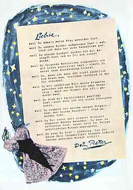 sind diejenigen jungen Mädchen, die sich geistig mit dem Beruf des Mannes beschäftigen können, die inneren Charme haben und die trotzdem etwas vom Haushalt verstehen. Man sollte die sogenannte >große Liebe< eigentlich schon hinter sich gebracht haben, wenn man sich verheiratet. Die wirkliche Liebe kommt wohl erst in der Ehe...Den weltgewandten Mann ziehe ich vor, da er mir über meine eigene Unsicherheit hinweghilft." (1954)