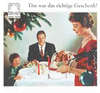 vermag auch die Frau für diese instrumentierte Mechanik zu gewinnen. Das zu können: dazu gehört vornehmlich eine intuitive Psychologie, ein Kennen der Frauenseele. Handelt es sich dabei noch um die schmackhaften Attribute eines guten Mahls, dann wird gerade die Frau an solchen technischen Hilfsmitteln besonders interessiert sein." (1957)
