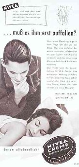 "Zunächst ja - bis nach den Flitterwochen. Dann kommt es aber darauf an, daß die Frau ihren Mann auch im Alltag nicht enttäuscht. Es sind oft nur Kleinigkeiten, von denen das häusliche Glück abhängt. Dazu gehört auch der gepflegte Fußboden. Tüchtige Frauen nehmen zur Pflege nur Sigella Edelbohnerwachs." - Zeitschriftenwerbung für Sigella, Ausschnitt (1952)