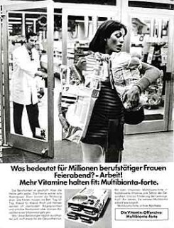 "Mehr Vitamine halten fit: Multibionta-forte. - Die Berufsarbeit ist geschafft. Aber die Hetze geht weiter: Die Familie wartet aufs Abendessen. Dann kommt die Wohnung dran. Die Kinder müssen ins Bett. Tag für Tag. Abend für Abend. Kraft und Nerven werden oft überfordert. Abgespanntheit und erhöhte Reizbarkeit aber können Anzeichen eines Vitaminmangels sein. - Zeitschriftenwerbung (1974)