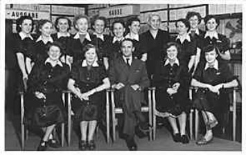 | | | Der Leiter "des Herren- Kinder- und Hausschuhlagers" im Kreise seiner Verkäuferinnen - Privatfoto (1952) | | |