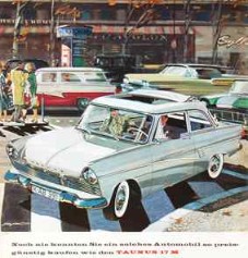 | |  | |  | | Auto-Union | | "Noch nie konnten Sie ein solches Automobil so preisgünstug kaufen wie den Taunus 17M" | | "Unter den schönsten Automobilen eines der besten - Taunus 17 M de Luxe" |