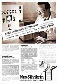 | |  | |  | | "Schenken Sie ihm doch zu Weihnachten einen Remington" | | Remington FOUR-MOST - "Aah - der Neue" | | Neo-Silvikrin - "die biologische Haarnahrung!" - "Geiger-Zähler bestätigt die wunderbare haarnährende Kraft von NEO-SILVIKRIN!" - "Für die Untersuchungen wurde Neo-Silvikrin radioaktiv gemacht und in die Haut einmassiert. Das nachwachsende Haar wurde mit Hilfe des Geiger-Zählers auf Radioaktivität geprüft."