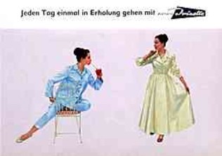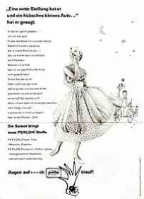 | | Jona Jersey Kleidung | | dralon - "Von jetzt an können Sie auch Ihre wolligen Kleider ohne Bedenken waschen!" | | "Eine nette Stellung hat er und ein hübsches kleines Auto..." hat er gesagt. Er hat mir gleich gefallen... und ich ihm auch. (...) Was bin ich froh, daß ich mir das PERLON-Kleid noch gekauft habe." - Mehr zum Frauenbild der 50er Jahre HIER |