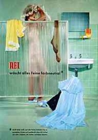 "Sauerstoff wird knapp" "Luftverstaubung bedroht Hautatmung - Die ständig zunehmende Verstaubung und Verschmutzung der Luft birgt eine Gefahr in sich, die keinesfalls unterschätzt werden darf: Die Poren der Körperhaut werden verstopft und können nicht mehr genügend Sauerstoff aufnehmen. Dadurch wird die natürliche Hautatmung, die sehr wichtig ist für das gesamte körperliche Wohlbefinden, empfindlich geschwächt. Dieser Sauerstoffmangel kann zu mannigfaltigen Gesundheitsschädigungen führen und der erste Anlaß zu Zivilisationskrankheiten sein. Es kommt also darauf an, die Hautatmung zu aktivieren." - "Eine neue Aera des Badens hat begonnen - Wasser allein genügt nicht! Ein Schaumbad mit REI in der Tube ist das ideale Mittel zur gründlichen Säuberung und Belebung der Haut." - Zeitschriftenwerbung