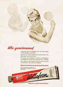 | | "Wie gewinnend wirken Sie, wenn Sie gepflegt sind, sich sicher fühlen und Sympathie ausstrahlen. Zu einer so richtig sympathisch erscheinenden Frau paßt aber keine wirre Frisur... Ihr Friseur, der Fachmann, rät Ihnen zu Wellaform, weil Wellaform das Haar wunderbar legt."