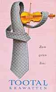 | | "Zum guten Ton: TOOTAL KRAWATTEN" | | "Zur sommerlichen Edson Kronen Foulard-Krawatte trägt der Herr gen ein schmückendes Taschentuch aus gleichem Material; es ersetzt die früher so beliebte Knopflochblume."" |